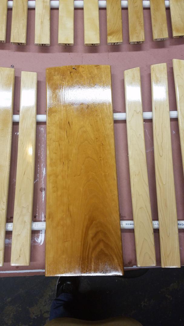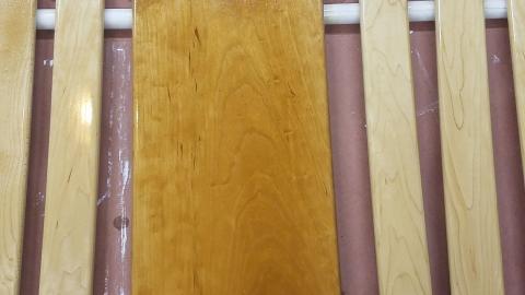 After the glue was dry and cleaned up, I gave the legs and rails a final sanding and was ready to apply finish. Of course, that was an interesting task as well, as I couldn't assemble the full crib since the side rails are removable. So I had to come up with a creative clamping solution to hold the panels up while I applied the finish. Luckily, with the pickets pre-finished I could hold on to them with this clamp on a clamp on a square with a weight art piece.