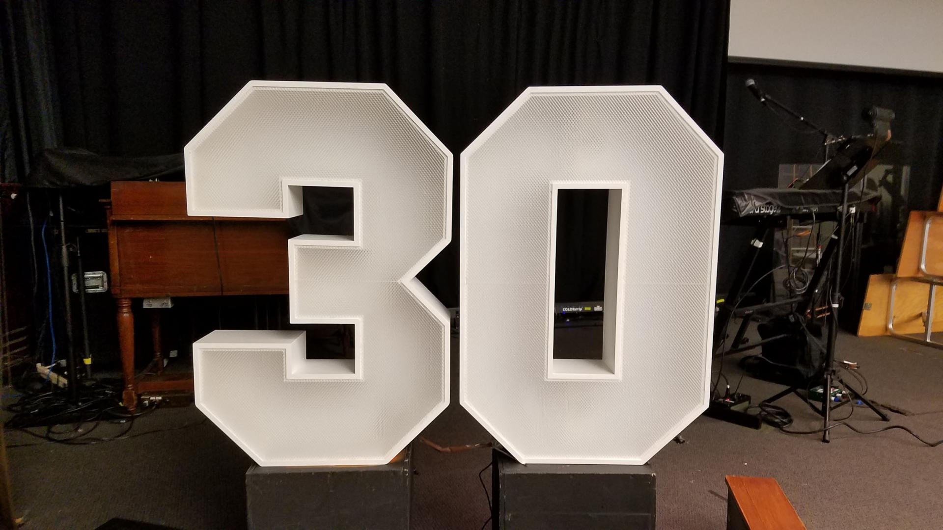 My church was celebrating 30 years of ministry in the South Bay and the team in charge of decorating wanted some large numbers to put up on the stage. The idea came up of making them 3D and having them light up since during service the auditorium gets pretty dark.