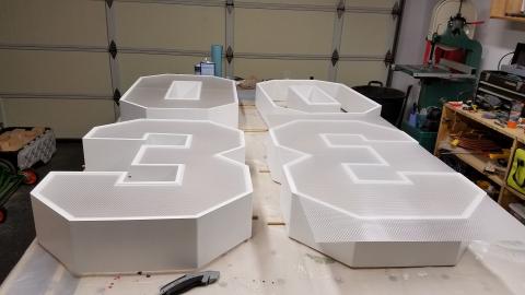 After the glue dried, I covered the numbers with a few coats of paint inside and out. Then I could trace and cut out the back solid panels and the front acrylic panels. I used commercial ceiling light diffuser panels and cut them to shape with a cutting wheel on a rotary tool (Dremel).